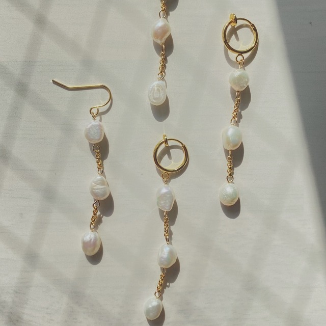 上品な輝きを放つ3連バロックパールのイヤリング/ピアス。 バロックパールの繊細な形状は、海の波や風に揺れるようでとても美しいです。 3連デザインで、耳元をより華やかに彩ります。 どんなシーンでも合わせやすい大きさなので、デイリー使いにも最適です。 ハンドメイドのため、ひとつひとつ個性があり、特別感を演出してくれます。 この3連バロックパールのイヤリング/ピアスで あなたの魅力をさらに引き立ててください。 まるで宝石のように輝くビジュアルと バロックパールならではの柔らかな質感で 極上のおしゃれを楽しんでみませんか。 ※パールはデリケートな素材ですので、取り扱いにご注意ください。 保管の際は専用ケースに入れてください。 ※商品は1点1点手作りしております。 そのため、商品ごとに若干異なる表情や風合いがある場合がございます。 予めご了承ください。 サイズ 縦 約7cm 横 約1.5cm カラー ゴールド×ホワイト 素材 真鍮 サージカルステンレス バロックパール ※ピアス・イヤリング部分はサージカルステンレスを使用しています ※ものによりかすれやキズがある場合がございます。 ※摩擦等により表面の塗装がはがれてしまう場合がございます。 ※メッキに色ぶれやざらつきが生じてしまうことがございます。 予めご了承ください。 (パーツによって、他のパーツと色と形のバラつきが生じる場合がございます。)