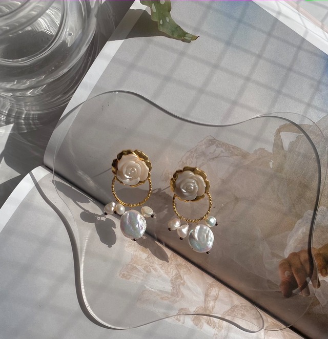 美しいヴィンテージローズと上品な淡水パールを使用したMARIE(マリー)の2WAYピアス。 華やかなローズの花が耳元で揺れる姿はまさに花魅力そのものです。 パールを組み合わせることで、大人の上品さも演出されます。 サイズ ヴィンテージローズ部分 直径約2.5cm 淡水パール部分 高さ 約4.5cm 直径 約2.5cm 組み合わせた状態 縦 約6cm 横 約2.5cm カラー ゴールド×ホワイト 素材 真鍮 淡水パール ピアス部分はサージカルステンレス ※ピアスのみの販売です 【イヤリングコンバーター使用可能】 ※別売のイヤリングコンバーターでイヤリングとしてもご使用いただけます ※ものによりかすれやキズがある場合がございます。 ※摩擦等により表面の塗装がはがれてしまう場合がございます。 ※メッキに色ぶれやざらつきが生じてしまうことがございます。 予めご了承ください。 (パーツによって、他のパーツと色と形のバラつきが生じる場合がございます。)