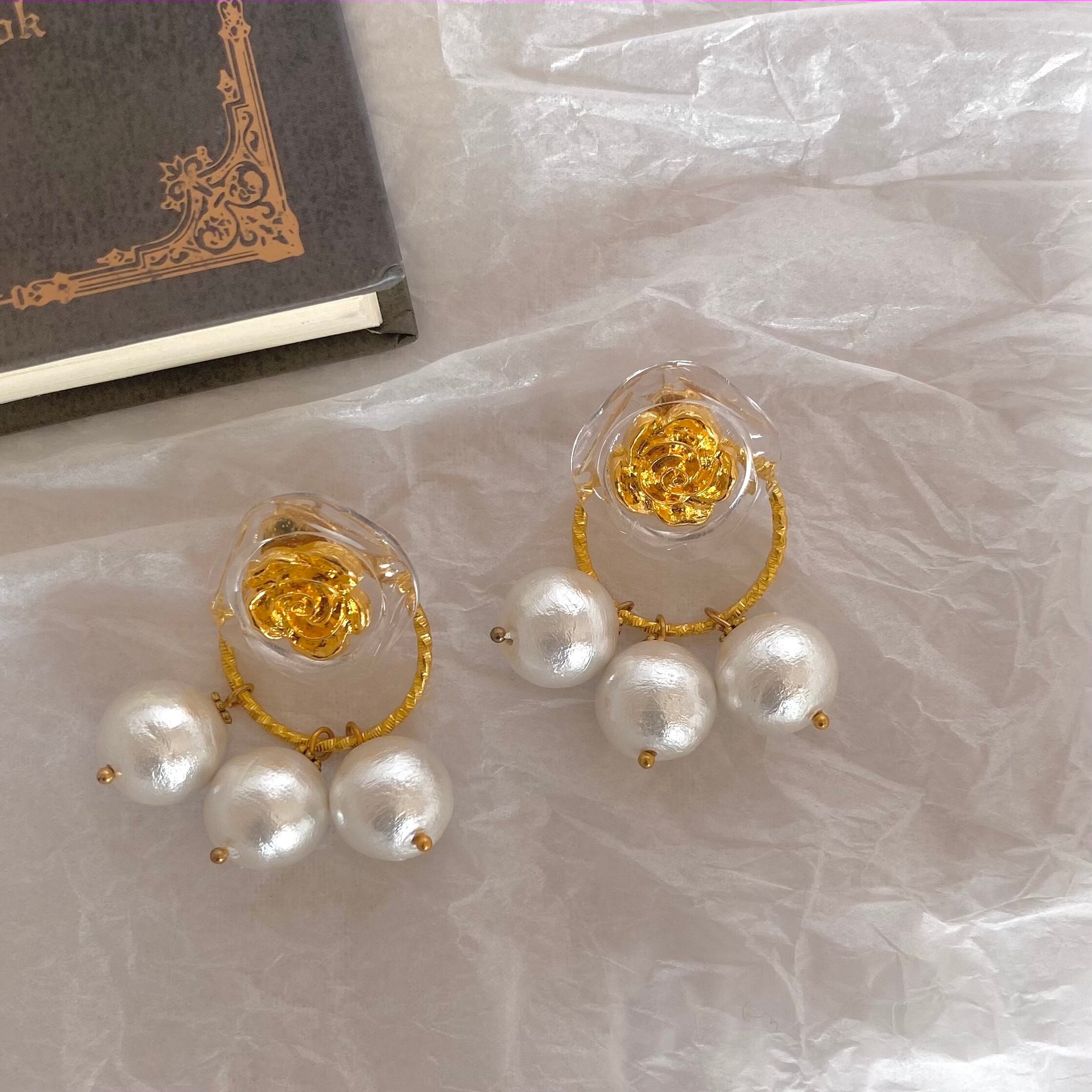 クリアな花のモチーフと上品なコットンパールを組み合わせた