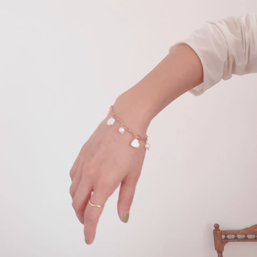 淡水パールとシェルパーツの組み合わせが上品なスタイルを演出し