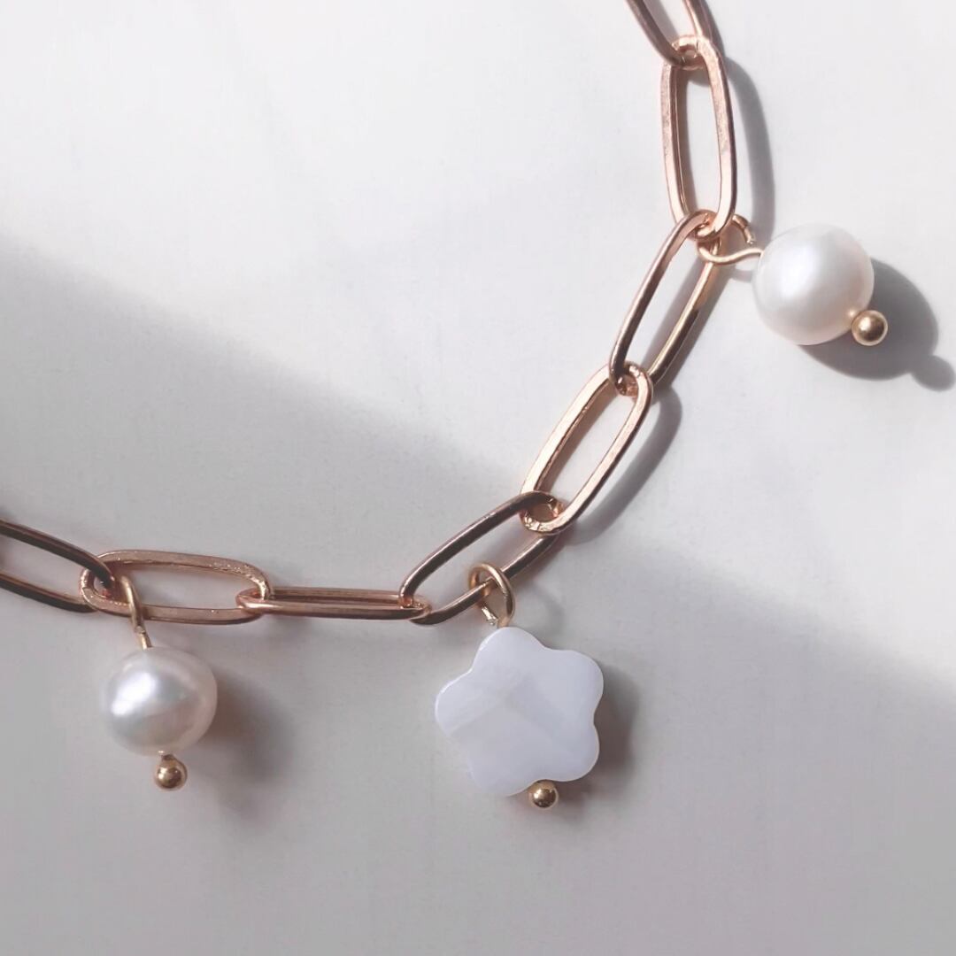 美しい淡水パールと華やかなシェルパーツが引き立つ