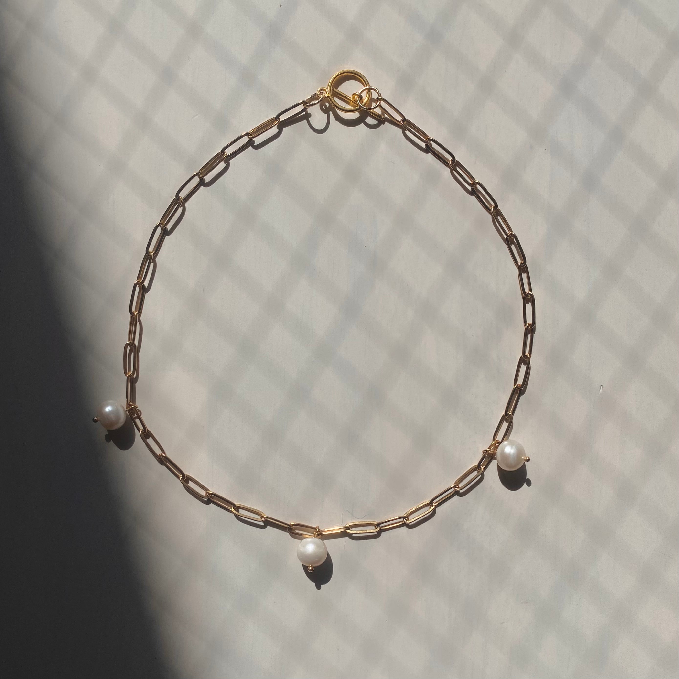 淡水パールが美しく輝き、ゴールドのステンレスと巧みに組み合わさることで、